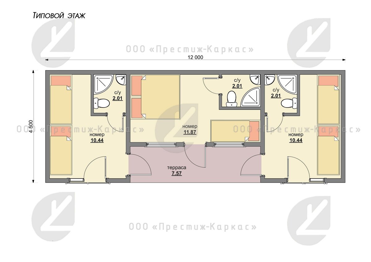 Если Вы ищете проект идеальной минигостиницы, то попали по адресу. При незначительных габаритах, КН-11 размещает в себе 6 номеров. Два из которых рассчитаны на наличие доп.места.